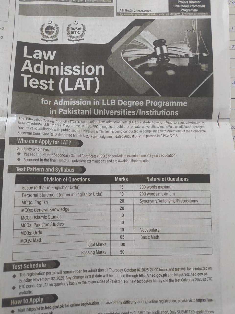 See below the LAT advertisement for the 2025 LAT exam. The last date to apply for LAT is 16th October 2025.